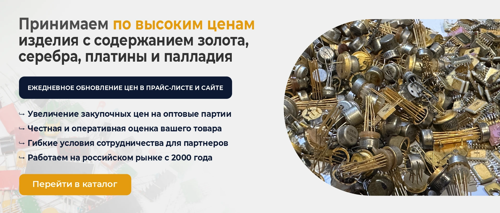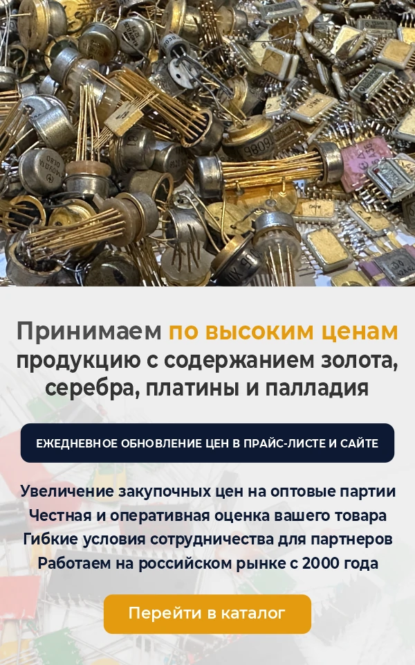 Радиодетали, микросхемы, приборы, ювелирные изделия, техническое серебро, лабораторную посуду, кабельную продукцию, электронные платы и прочие изделия с содержанием золота, серебра, платины, палладия, родия и иридия